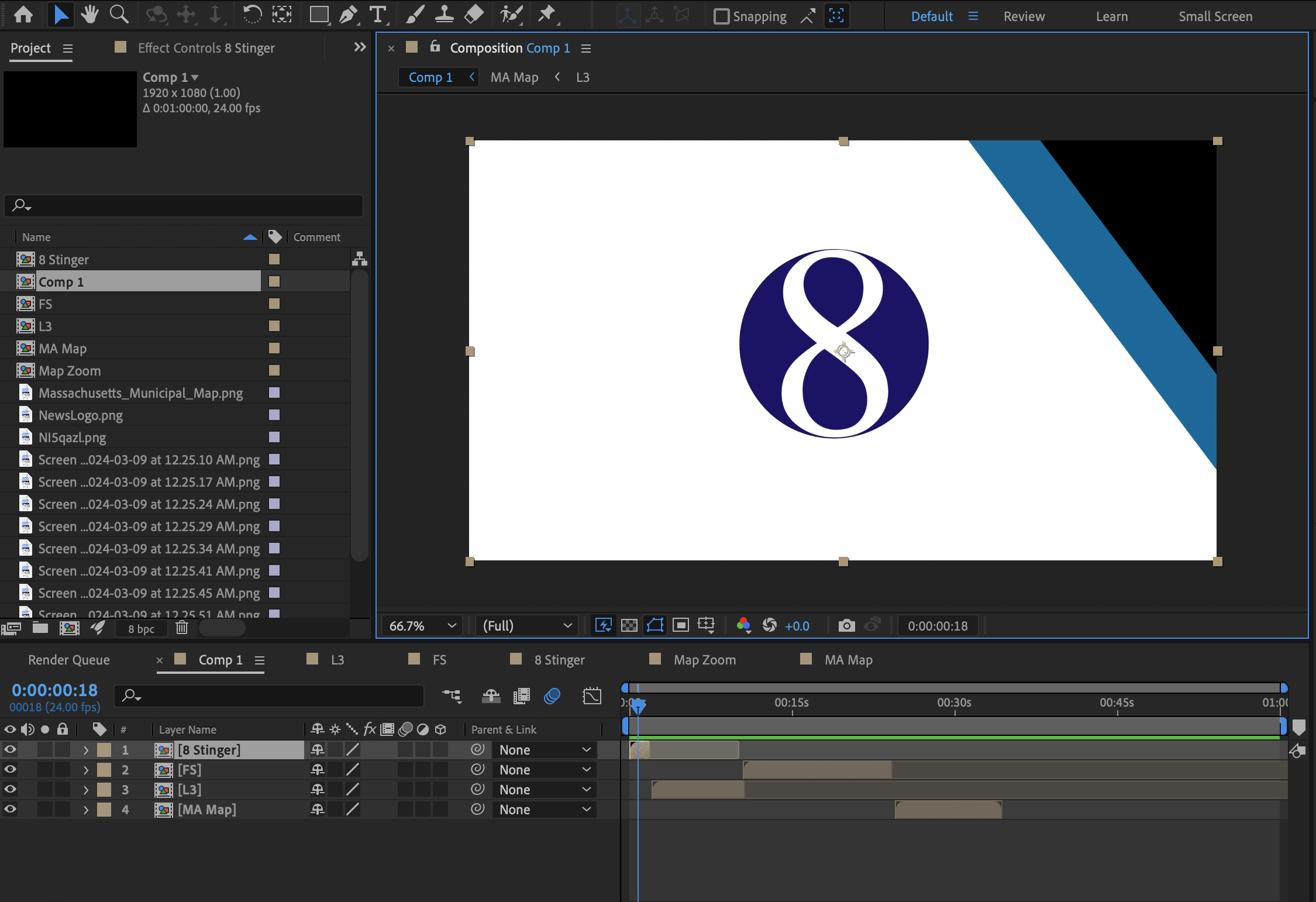 As someone who works in news, this was a really fun project to execute. At work every day, I customize graphic templates to convey information during my show. This allowed me to create my own look for graphics that I could also easily customize with text. Overall, I think this short sample of news graphics came out well and showed off some of the many skills I have learned on Adobe After Effects.
